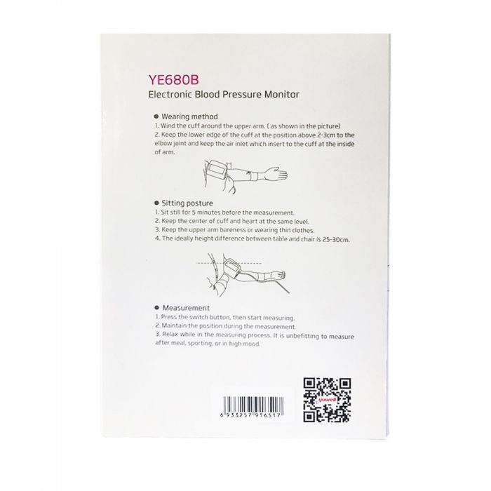The YE680B is a very high quality digital blood pressure monitor with a large display. It has better readings memory especially for two users, irregular heart beat detection, cuff wrapping detection, and blood pressure range indication. The unit comes with one adult arm cuff.